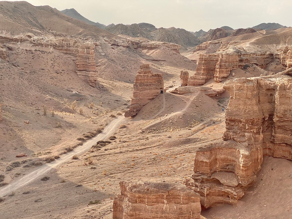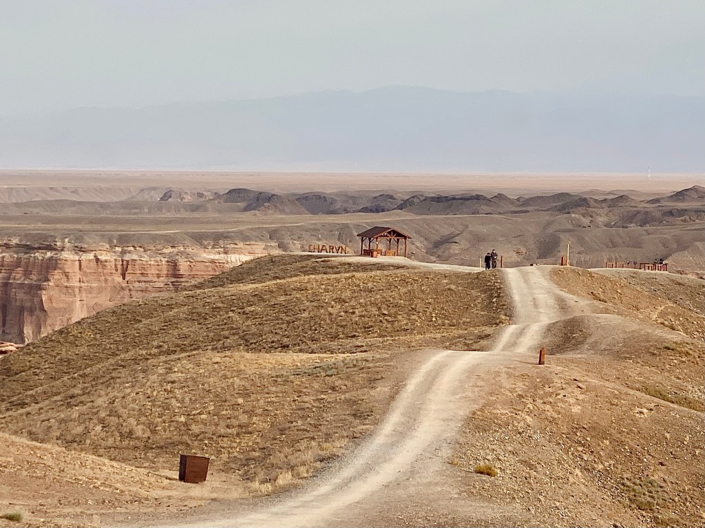 Rời hồ Kolsai lúc 1h trưa, xe đưa bọn mình đến vực Charyn khoảng 3h chiều. Charyn Canyon nằm ở rìa phía đông Almaty, cách thị trấn biên giới Tân Cương, Trung Quốc – Kazakh – Horgos khoảng 100km về phía tây. Vực núi này hình thành cách đây 12 triệu năm. Do có thời tiết rất khắc nghiệt: mùa đông nhiệt độ giảm xuống âm 20 độ và mùa hè nhiệt độ lên đến 43 độ nên khu vực này không có người sinh sống và được xếp vào hàng di sản thiên nhiên quốc gia. Vực Charyn có nhiều hẻm núi khác nhau, nhưng hẻm nổi tiếng nhất vẫn là Castle of Valleys với những trụ đá nối nhau xen kẽ, bên dưới là con đường đất độc đạo chạy thẳng đến một thung lũng với con sông Charyn gần đó.