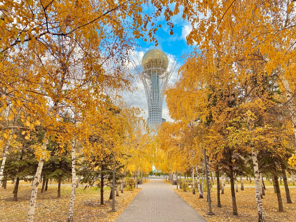 Đặc biệt, ngay trung tâm Astana, bao quanh bởi 4 hướng là 4 vườn thông đổi lá vàng siêu đẹp – là toà Bayterek – cái tháp tượng trưng cho cây thế giới trong truyện thần thoại – nơi thế giới tạo thành. Đặc biệt lá vàng ở đoạn này rất đẹp và dày đặc, cứ kiếm một hàng cây lá vàng là có ảnh đẹp liền. Mình ko lên tháp nhưng nghe nói lên phải trả phí. Với mình thì cái khu vườn bên dưới Baiterek đã đủ đẹp rồi