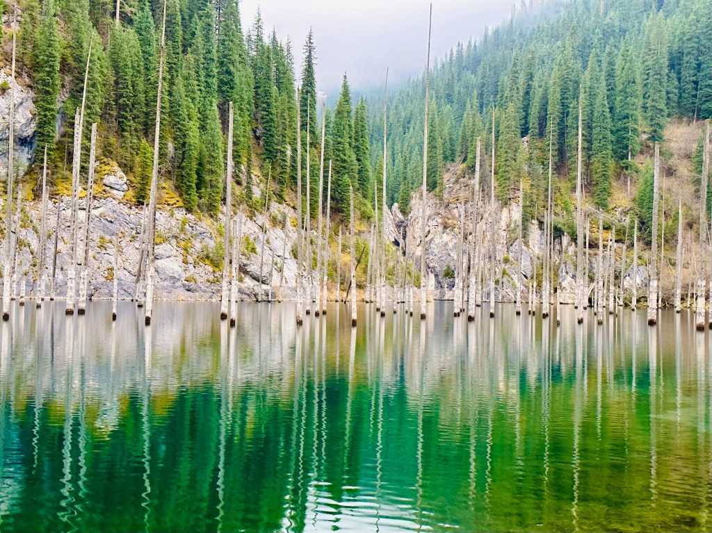 Hồ Kaindy là hơi khó đi hơn hồ Kolsai, nhưng cũng là một địa điểm đẹp với rừng cây bạch dương mọc ngược dưới nước. Nước hồ cũng trong và xanh như hồ Kolsai. Để tới hồ Kaindy, bạn phải dừng tại làng Saty để tìm xe đi tiếp đến hồ Kaindy nếu xe của bạn ko phải xe địa hình 4×4. Đường vào hồ Kaindy khá xấu và mất khoảng 40 phút đi từ làng Saty. Đến hồ rồi, bạn vẫn cần đi bộ thêm 10 phút để xuống lòng hồ. Do lantour của mình từ Kyrgyzstan vượt cửa khẩu qua lại Kazakhstan đã bao gồm dừng tại Kaindy nên mình ko rõ đi xe từ làng Saty mất bao nhiêu tiền. Nghe nói khoảng 2000 Tengeh một người cho 2 chiều. Hồ Kaindy này nhỏ hơn Kolsai nên chỉ cần 30 phút là tham quan hết hồ rồi. Vì những lý do xa xôi như vậy nên việc kết hợp cả 3 nơi trong cùng một ngày và quay về Almaty là không thể, trừ khi bạn đi theo kiểu check in hoặc bạn ngủ lại ở Saty một đêm.