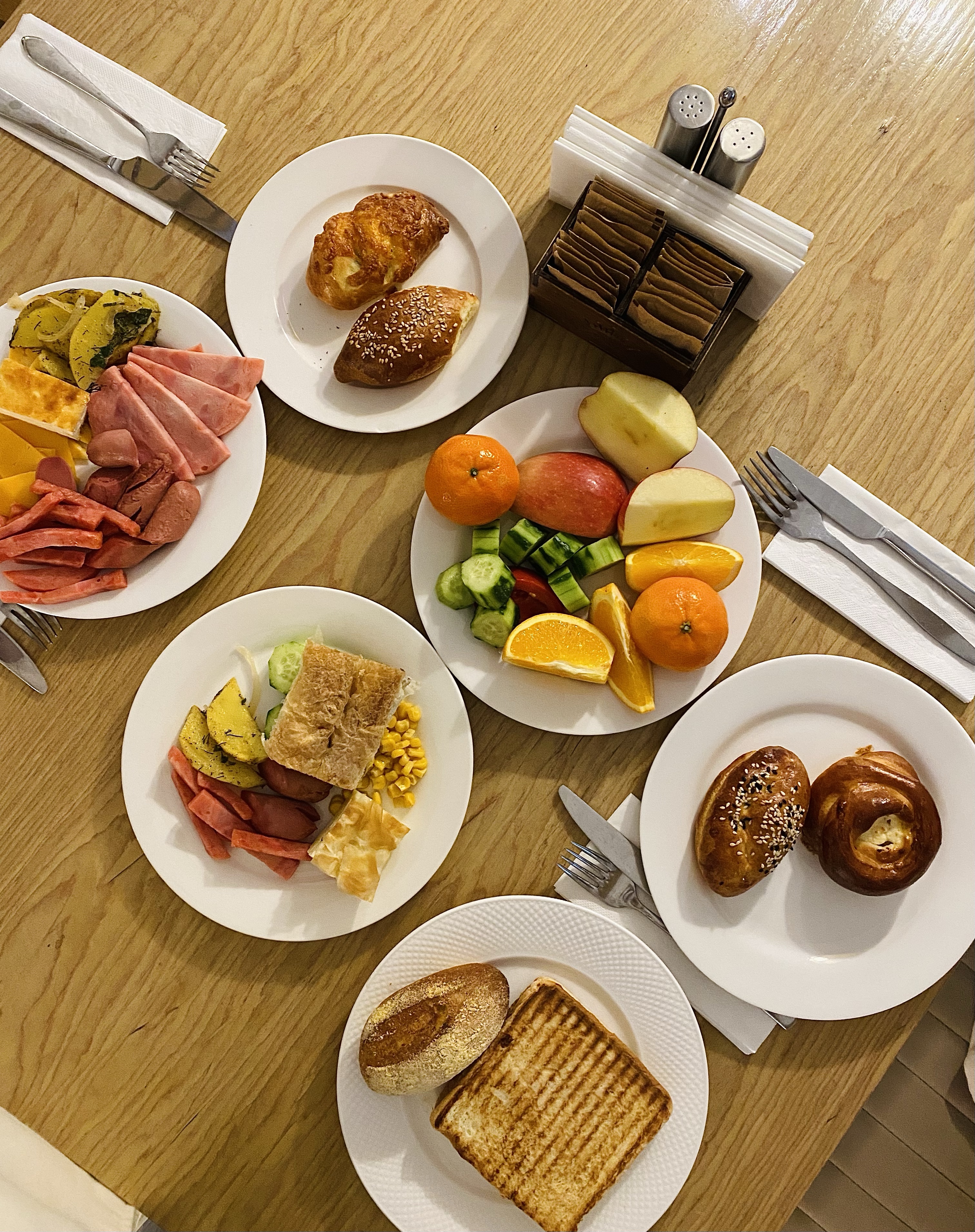 Astana – Vip House Hotel – Hotel này nằm trên tầng 38 của một toà nhà. Đường vô hơi lắt léo, nhưng người ta sẽ Whatapps cho bạn cách đi đến. Cơ bản là đi tới cái toà nhà đó, lên cầu thang ngay cửa toà nhà, từ tầng 1 đi thẳng một chút bên tay trái có cái cổng Dotysik 5/1 thì quẹo vô bấm chuông để bảo vệ mở cửa. Vào đó bấm tiếp thang máy lên tầng 38 – kiểu như một chung cư vậy. Ở đây do nằm trên cao nên có view skyline thành phố rất đẹp. Tối lên đèn bao ảo. Chỗ này có 3 lựa chọn ăn sáng nhưng bọn mình toàn chọn trứng chiên, bánh mì, trà và sữa chua. Cứ mỗi 8h sáng sẽ gọi bạn mở cửa phòng để mang vào. Nếu cần xe ra sân bay mà app
