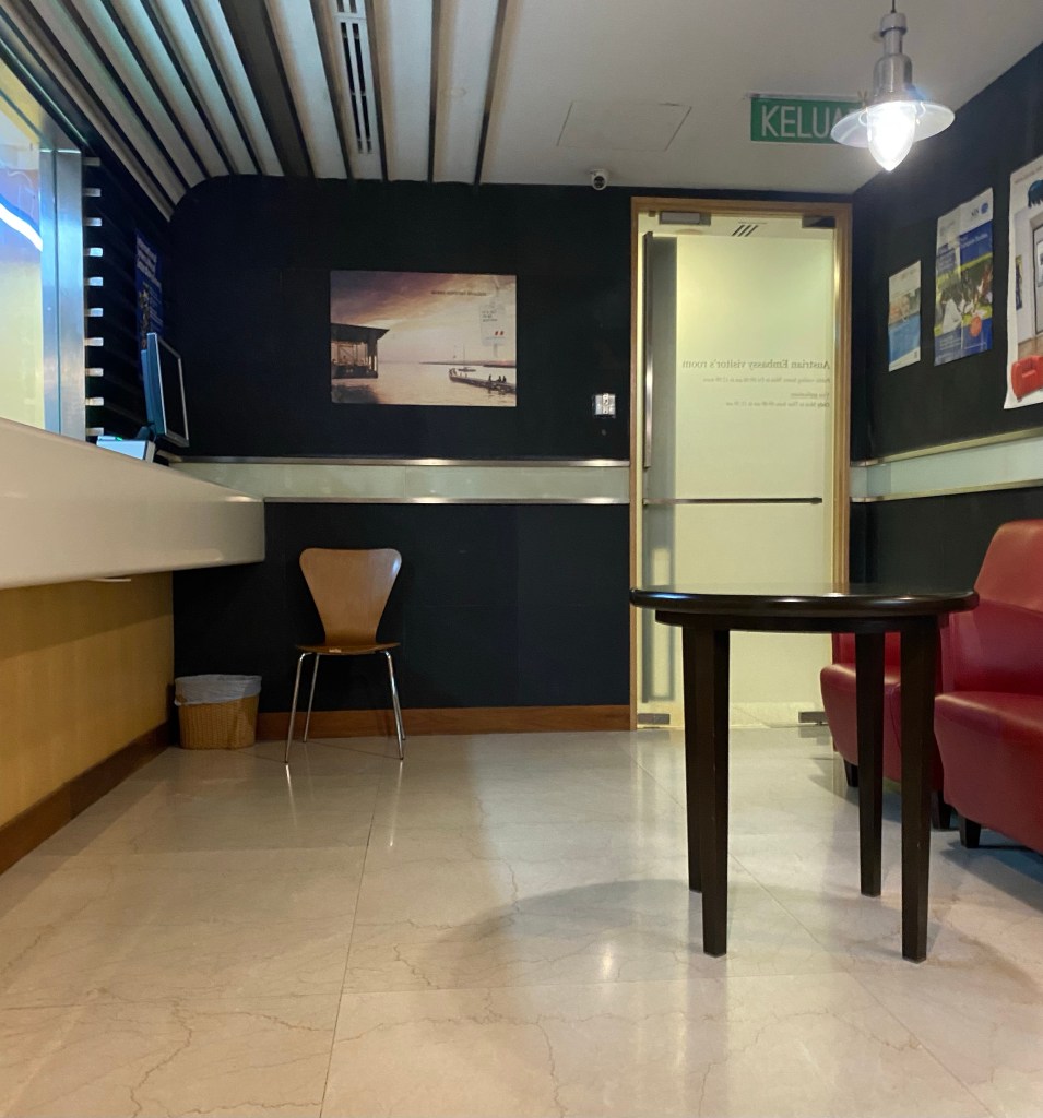 Lãnh Sự Quán Áo nằm ở toà Wisma Goldhill tầng 10 – ko có bảo vệ check như Lãnh Sự Quán Pháp. Vào thì nộp hồ sơ rồi đợi người ta lấy vân tay thôi.