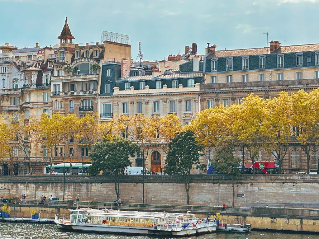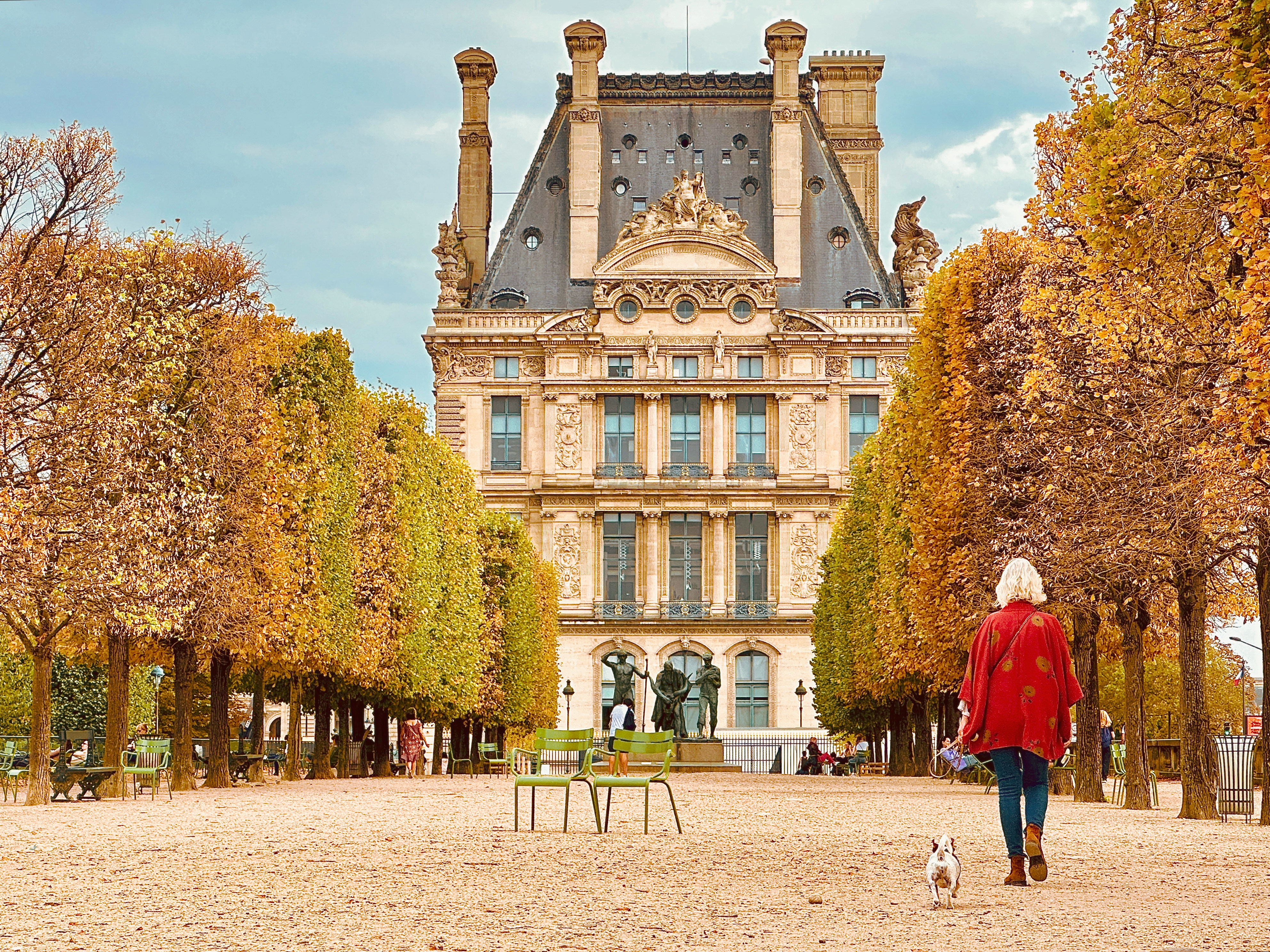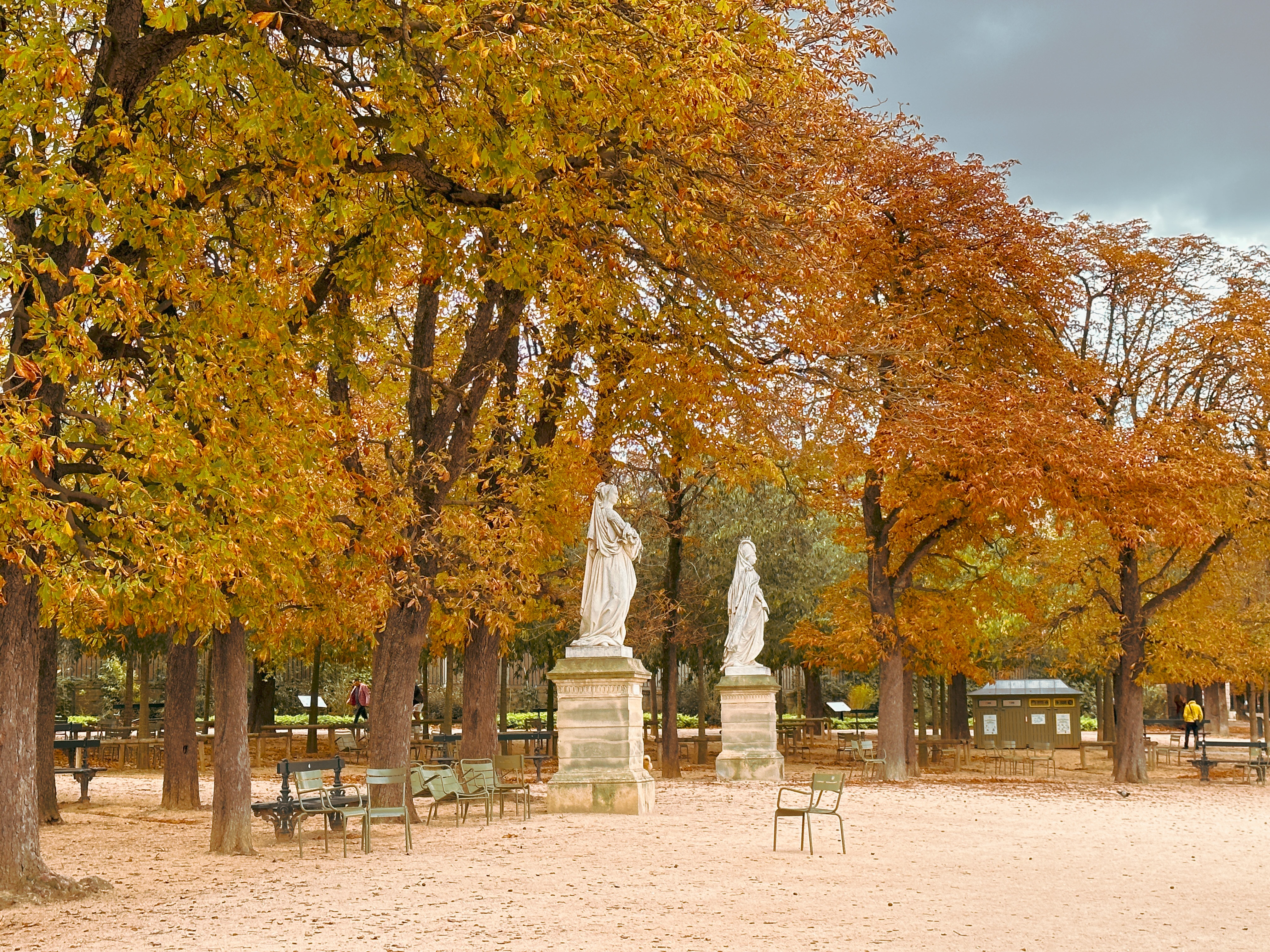 Còn vườn Tuileries cũng là nơi mà mình thấy lá vàng khá đều ở Paris, bên cạnh vườn Luxembourg. Ngay cổng bên phải của vườn Tuileries, gần Pont Royal là cái view chụp ảnh rất đẹp và nghệ, mình cực kỳ thích view này, đặc biệt là có mấy cái ghế ngồi chill chill nữa. Trời mát mẻ, không khí trong lành cảm thấy xả stress rất hiệu quả. Cũng như vườn Luxembourg thì mình cũng khá thích vườn Tuileries này từ thiết kế cho đến không gian cây xanh.