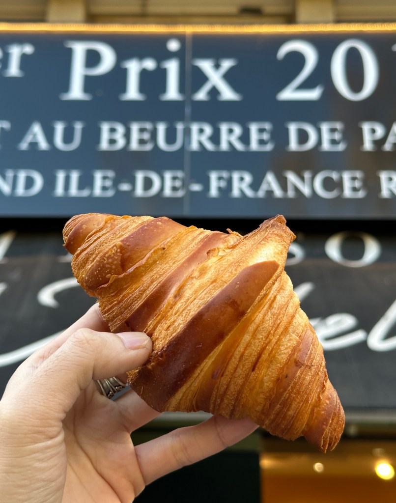 Bánh sừng trâu chân ái trong lòng mình. Độ ngon thì chắc ăn mình ăn cũng kha khá Croissant 3,4 lần gì đó nhưng ở đây là ngon nhất. Thơm bơ, béo béo và bánh rất rất giòn luôn. Bị cái xếp hàng hơi đông chừng 10 phút. Một cái giá 1,2 Euro. Ngoài ra bên trong còn bánh đủ thứ bánh khác nếu bạn muốn thử như bánh Flan (không phải món Flan tráng miệng ở Việt Nam) hay bánh Pain Au Chocolat. Bánh ngọt của Pháp thì khỏi bàn độ nổi tiếng rồi, nhưng chất lượng thực sự xứng với giá tiền. Bánh xốp, mới nướng, rất thơm và ăn không bị quá ngọt